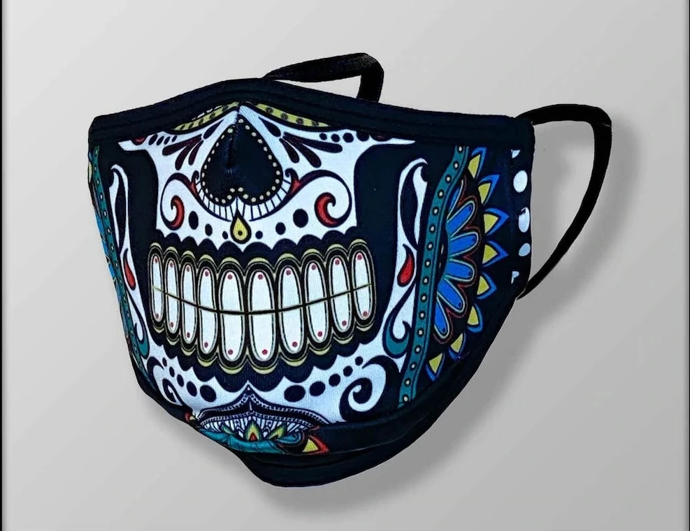 The INKnBURN Calavera 3-Layer Face Mask is perfect for Halloween and Día de los Muertos (Day of the Dead). These colorful and ornate bones are not presented to terrorize. Instead, they represent the playfulness of the dead, as they mimic the living and frolic amongst us… reminding us not to take ourselves too seriously. A great mask to wear throughout the year for remembering those lost or simply to make sure you are remembered every time you wear it!