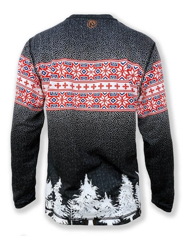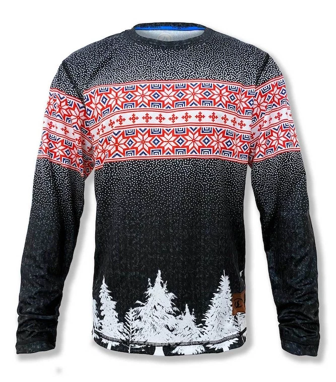 The INKnBURN 2020 Long Sleeve Holiday Tech Shirt has that nordic sweater look without the scratchy wool! Art that looks like a knitted sweater on our Dry I.C.E. Fabric so you stay cool and comfortable for anything from holiday-themed runs to office parties. The 2020 design features falling snow over a dark, chunky charcoal knit. Snow-covered pines across the bottom and a festive red-patterned stripe across the chest and arms make this a great top you can wear all winter long!