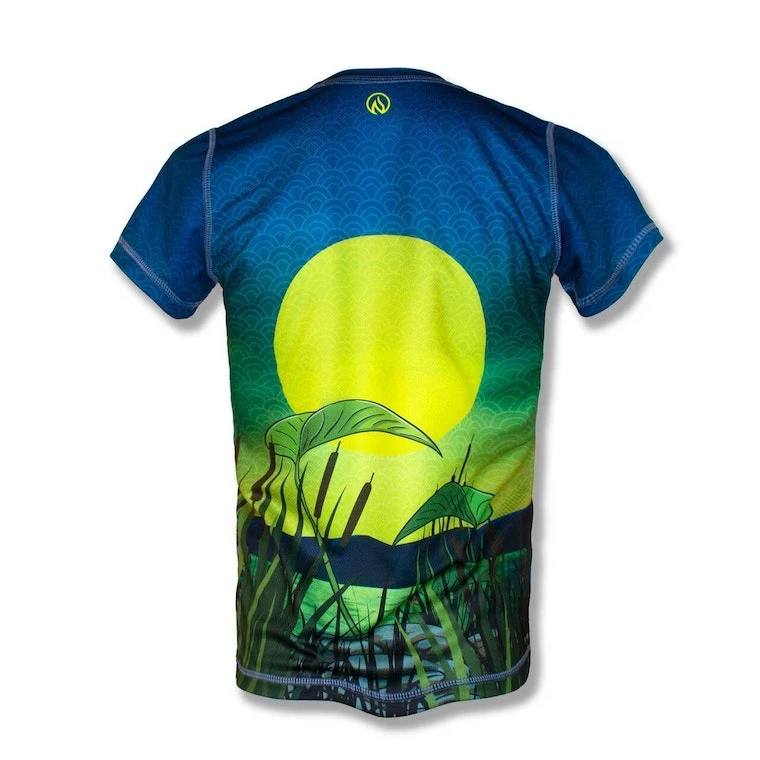 The tranquil colors of the outdoors at dusk and a wise old frog enjoying the abundance of a simple life. In Japan, “Kaeru” the word for Frog , sounds like the word for return. Because of this, they are often given as a charm to wish someone a safe return. They also represent good luck and prosperity. This light-weight, tech shirt is designed for speed, but also works well as a cool, kick-back top that won’t show sweat! INKnBURN apparel doesn’t fade, so this tech will look great years from now! Vibrant art you can’t feel, on our super-light, moisture-wicking Dry I.C.E. Fabric. 100-Mile tested by ultra runners for comfort at extreme distance and a unique, head-turning design.