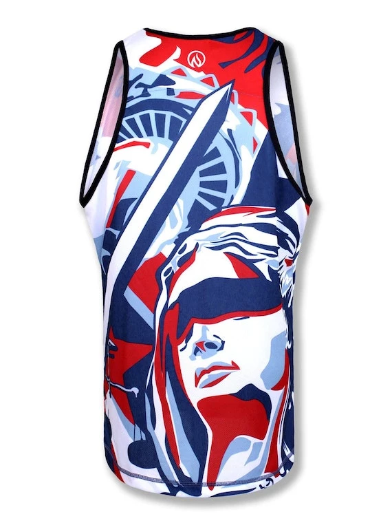 The Men’s Liberty and Justice Singlet features the Lady herself in a dynamic and graphical style. Justice rules the back with her scales and sword. The perfect singlet for all those awesome 4th of July races and after-parties. Also great for MCM or even the New York Marathon! Bold and bright, this top will make you yearn to set your tired, poor feet free and get out for a run or workout!
