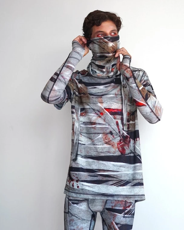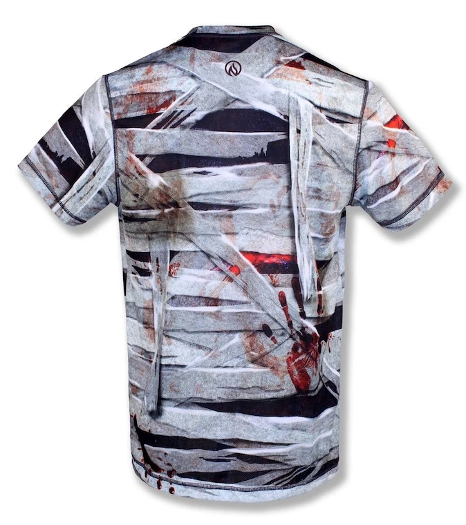 The INKnBURN Men’s Mummy Tech Shirt is the most functional mummy wear you’ll ever encounter. Since it is all art, you won’t be tripping over gauzy bandages or have any organs slipping out during your run. A great look to turn some heads and have a scary good time! Be sure to get the Tech Tube, Headband, Sleeves and Tights to get the whole effect! All made with our Dry I.C.E. Fabrics to keep you cool and comfortable while you shock and frighten your friends, family and spectators at your next race!