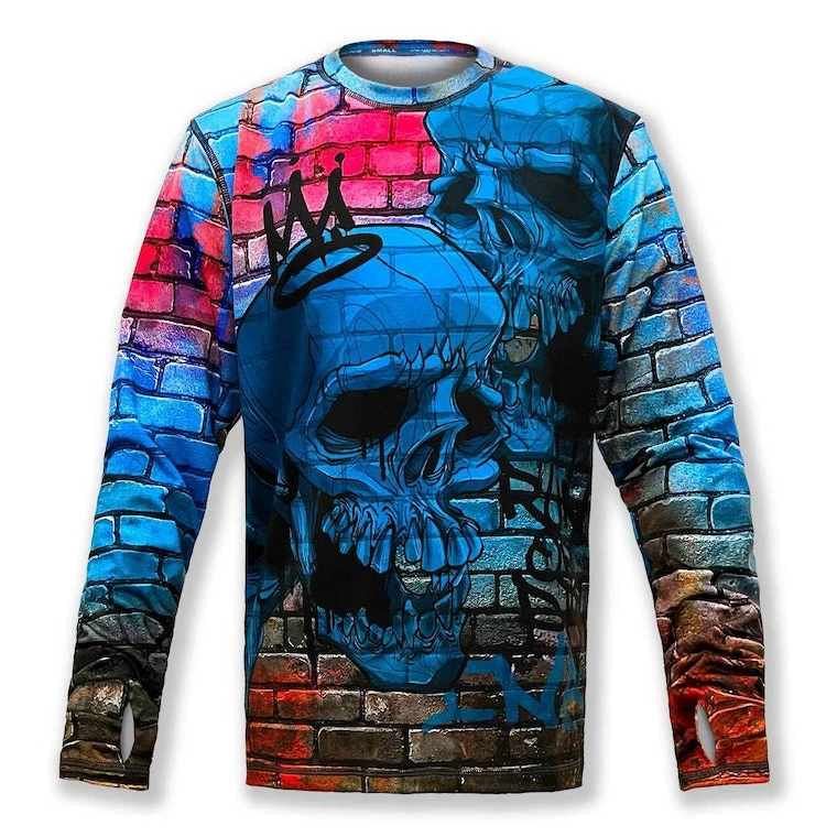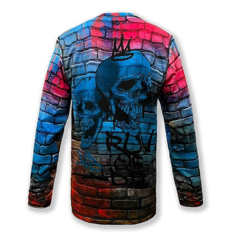 Graffiti, skulls and Run or Die™ on a brick wall… what more do you need to know? Make this top yours! If you haven’t tried an INKnBURN pullover before, you are in for a treat! They feel velvety soft on the inside, smooth and silky on the outside. The brushed interior keeps warmth in, while still wicking away moisture and letting air circulate through. The longer sleeves with thumbholes give you the option of pulling them down over your hands for extra warmth.