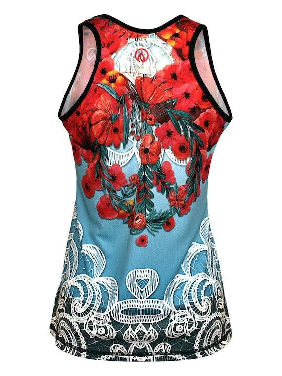 This INKnBURN Women’s Boho Singlet features poppies to symbolize finding your inner peace, a peace symbol to share the love with all you see and even a hidden lady bug for good luck! A beautifully vibrant, energetic and feminine design.This light-weight, race-cut singlet is designed for speed, but also works well as a cool, kick-back summer top that won’t show sweat! Vibrant art you can’t feel, on our super-light, moisture-wicking Dry I.C.E. Fabric. 100-Mile tested by ultra runners for comfort at extreme distance and a unique, head-turning design.