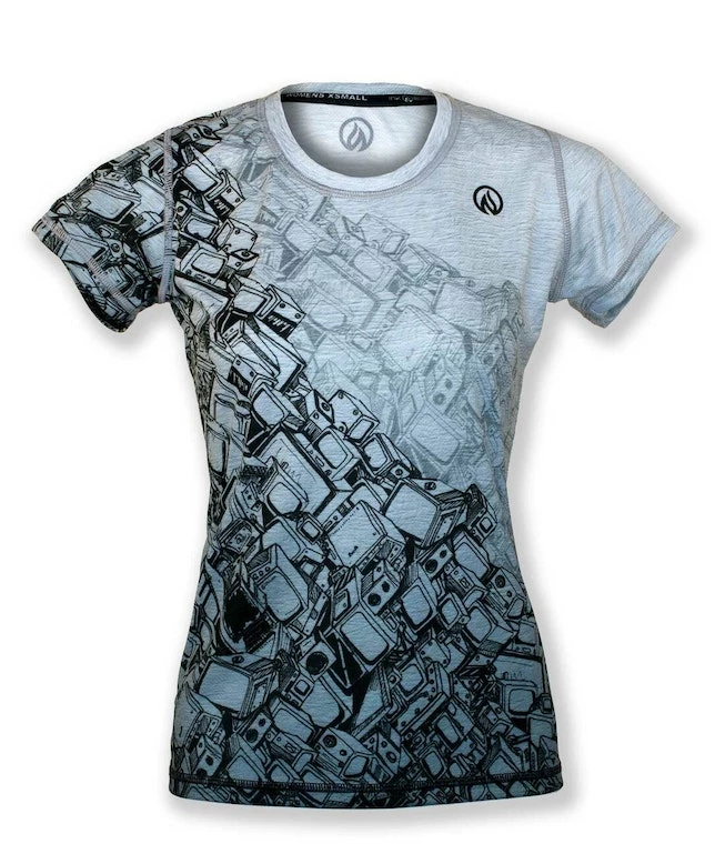 This new design by 17-year-old budding artist Kai Tsuyuki features old broken computers, the likes of which never existed in his life time. How did he draw them? Don’t know, he is 17 and doesn’t explain anything. Regardless, this hypnotic design will draw you in with the line work and mesmerizing soft blue light… kind of like a computer! This light-weight, tech shirt is designed for speed, but also works well as a cool, kick-back top that won’t show sweat! INKnBURN apparel doesn’t fade, so this tech will look great years from now! Vibrant art you can’t feel, on our super-light, moisture-wicking Dry I.C.E. Fabric. 100-Mile tested by ultra runners for comfort at extreme distance and a unique, head-turning design.
