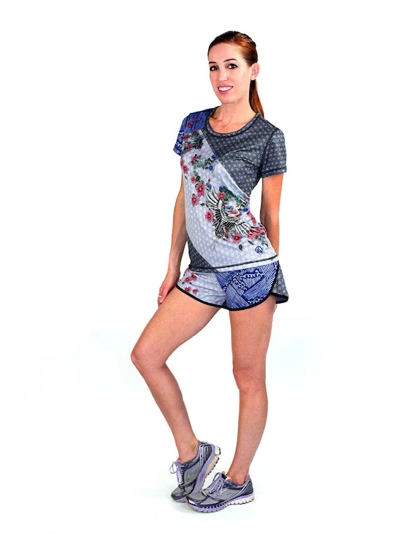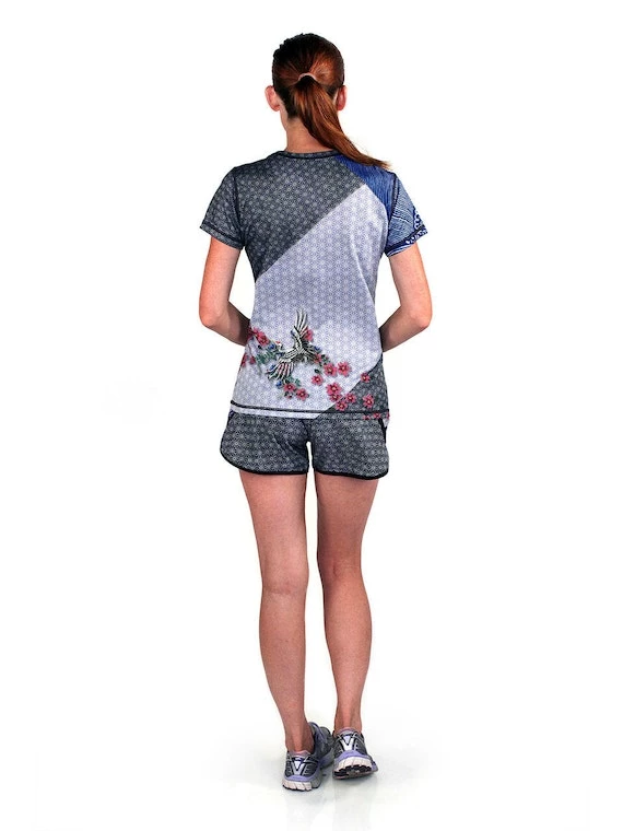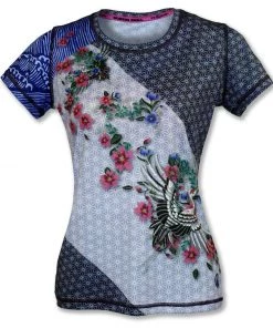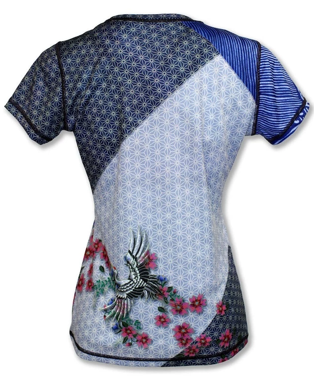 This Women’s Kaze Tech Shirt features royal cranes and pink cherry blossoms drifting across an asymmetrical composition of classic Japanese textiles. The combination of geometric and organic background patterns represent embracing both your analytical and emotional sides. In Japanese the word “kaze” means breeze, the perfect name for a shirt designed to give you the lift you need, to get through the toughest workouts, with style. This Dry I.C.E. Tech Shirt will keep you cool for any activity and won’t show sweat! Tested by ultra runners for comfort at extreme distance, this top will also get you through a tough day at work and won’t show sweat!