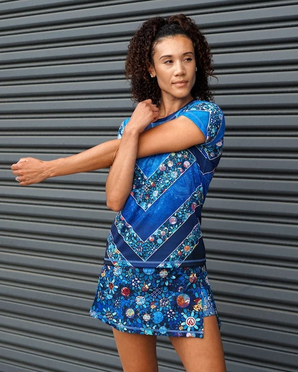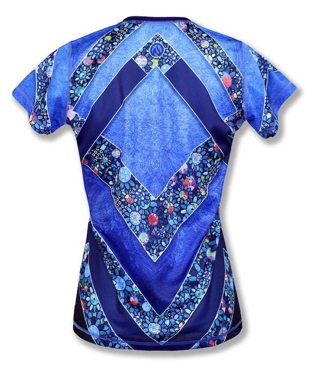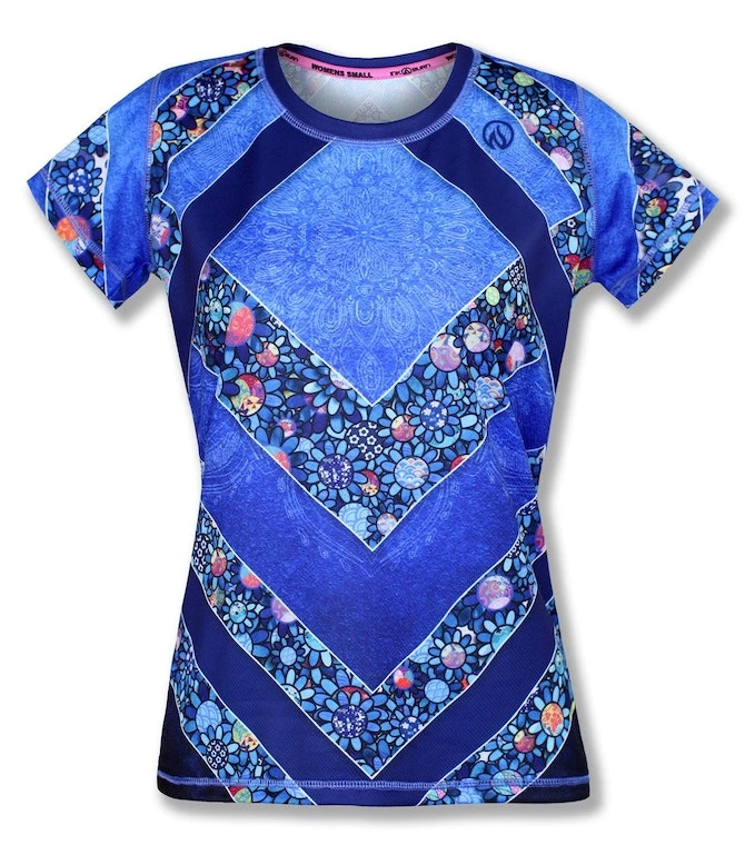 This Women’s Ladybug Tech Shirt features an adorable symbol of luck that you have to look closely to find! We created a floral design with the center of each flower featuring a different Japanese fabric pattern then hand-placed each flower. There are just a few ladybugs hidden among the flowers that fill up the form-flattering chevrons. Made with INKnBURN’s proprietary Dry I.C.E. Fabric, this top is light, cool and so comfortable you will want to workout more just so you can wear it!