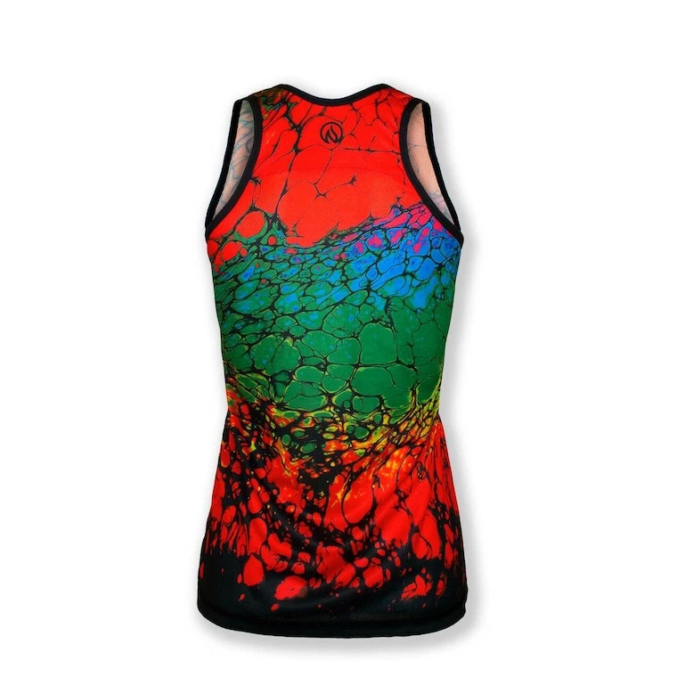 This stunning singlet was created with poured acrylics and a blow torch by artist Tristan Lawrence. They say, “Don’t play with fire!” but when the results are this great, Playing With Fire is a go! This light-weight, race-cut singlet is designed for speed, but also works well as a cool, kick-back summer top that won’t show sweat! Vibrant art you can’t feel, on our super-light, moisture-wicking Dry I.C.E. Fabric. 100-Mile tested by ultra runners for comfort at extreme distance and a unique, head-turning design.