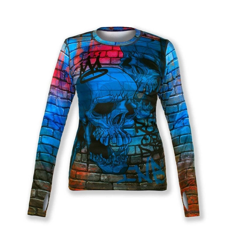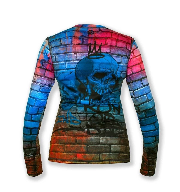 Graffiti, skulls and Run or Die™ on a brick wall… what more do you need to know? Make this top yours! If you haven’t tried an INKnBURN pullover before, you are in for a treat! They feel velvety soft on the inside, smooth and silky on the outside. The brushed interior keeps warmth in, while still wicking away moisture and letting air circulate through. The longer sleeves with thumbholes give you the option of pulling them down over your hands for extra warmth.