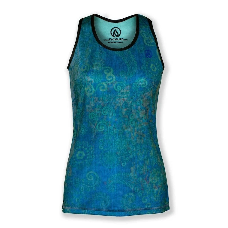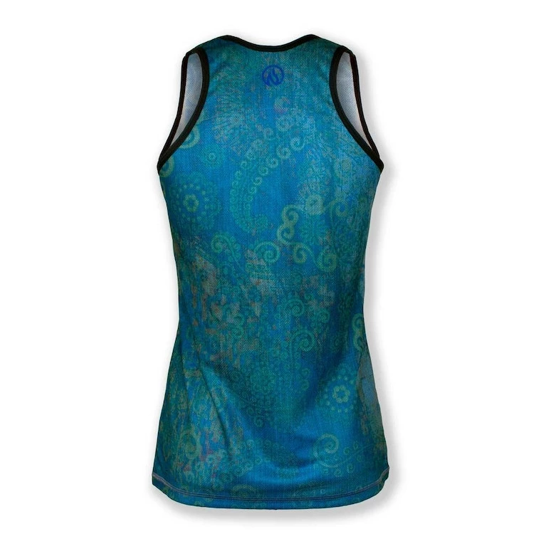 Inspired by the beautiful flow of paisley that represents new life, our Turquoise Paisley Singlet has flowing sprouts, vines and seeds intertwined in mesmerizing design and rhythm of the tropics. This light-weight, race-cut singlet is designed for speed, but also works well as a cool, kick-back summer top that won’t show sweat! Vibrant art you can’t feel, on our super-light, moisture-wicking Dry I.C.E. Fabric. 100-Mile tested by ultra runners for comfort at extreme distance and a unique, head-turning design.