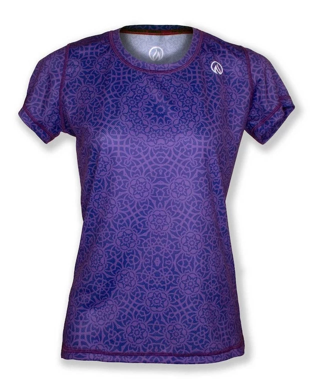 This INKnBURN Women’s Violet Mandala Tech Shirt represents calmness, creativity and wisdom, attributes associated with the color. Mandalas are also considered healing and their repetitive design soothing and spiritual. Put that together and you have a top to help you through the toughest workouts! Vibrant art you can’t feel on its super-light, moisture-wicking Dry I.C.E. Fabric. The fabric drys fast, won’t show sweat and will keep its color for years to come. Perfect for any activity where you sweat, but so beautiful and comfortable, you’ll find yourself wearing it like a regular t-shirt. 100-Mile tested by ultra runners for comfort at extreme distance and head-turning designs.