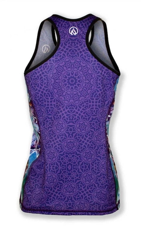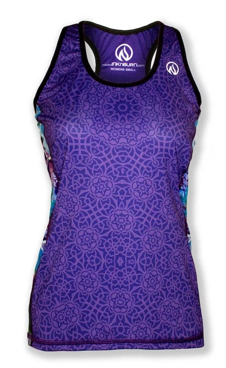 The color violet represents calmness, creativity and wisdom. Mandalas are also considered healing and their repetitive design soothing and spiritual. Put that together and you have a top to help you through the toughest workouts! INKnBURN construction features four flat-seamed panels for a body skimming fit and super-light feel that is a favorite of Elite Runners. Made with imported Italian fabric that is so light and silky, you’ll forget you have anything on. With such an airy, delicate feel it is hard to believe it is snag-resistant, SPF 30 and wicks away moisture too! Perfect for running, crossfit, spin and yoga. A beautifully unique running and workout top that won’t show sweat, but will inspire you to dig deeper and shine from within.
