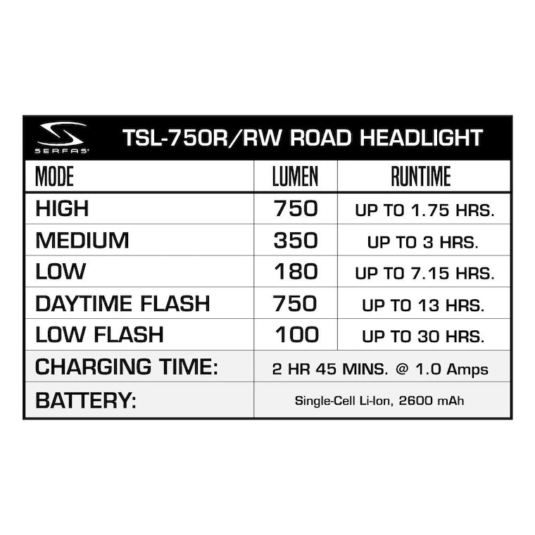 The Serfas© True 750 Road features 750 lumens of crystal clear bright night time illumination to make out every potential hazard and turn of the road and 280 lumens in Flash mode to make sure all eyes are on you. Even more, a wrap-around amber LED illuminated side marker projects bright ambient light for added side visibility to traffic and pedestrians. A smart extra large power button with LED backlit battery level indicator ensures surefire operation and convenient battery monitoring so there are no unwelcome surprises out on the road. Go-Pro® Bracket, Helmet Bracket and Bar Bracket Included.