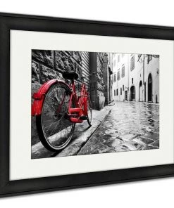 The artist descibes this piece as: Retro vintage red bike on cobblestone street in the old town. Color in black and white. Old charming bicycle concept.