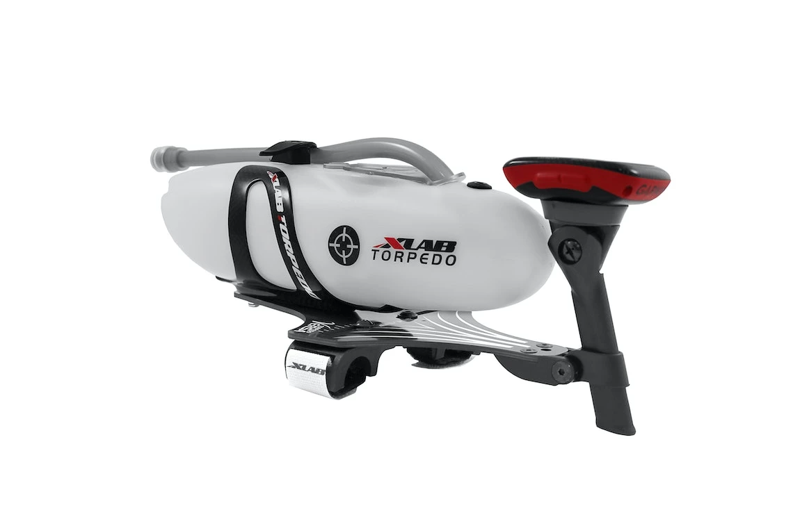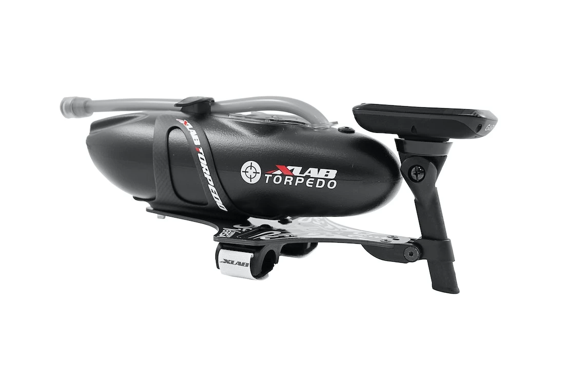Lightweight, carbon fiber aerodynamic aerobar hydration system with telescoping computer mount. Raise the computer mount up to tuck in a Refill Bottle for race day, or lower it down for a standard bottle to maintain the optimal view for training days. Includes composite mounting clamps, carbon fiber plate, carbon fiber Torpedo cage & Torpedo bottle with 2 lid options.